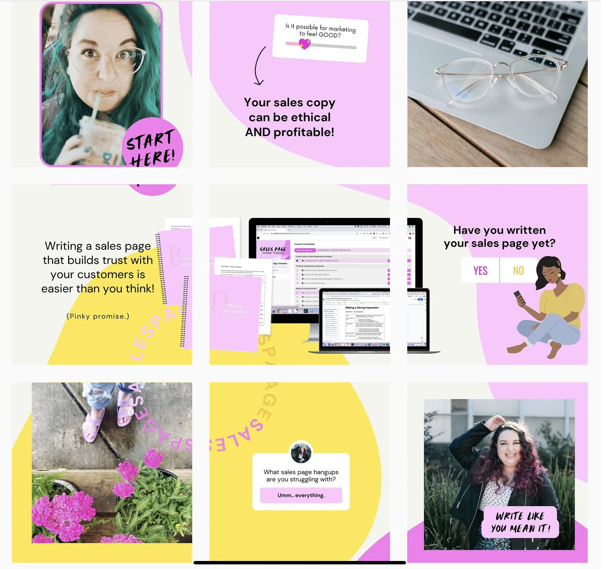 I help my clients write ethical sales copy and design Instagram sales funnels strategies that are clear (not just compelling) so that their leads can shop with agency and independence, find all of the information they need to prequalify themselves for an offer, and feel safe enough to purchase. This reduces the amount of time my clients have to spend fielding FAQs and pitching in their inbox, so they can prioritize that precious energy on promoting those offers or working on their visibility efforts!